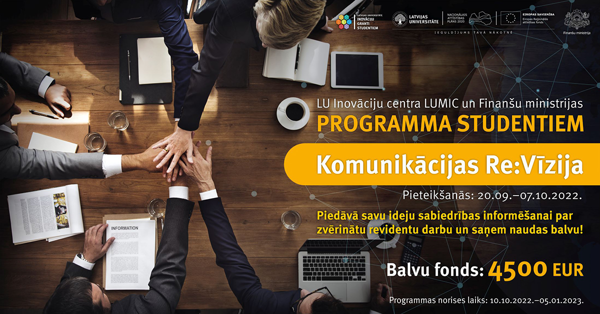 Latvijas augstskolu studenti jaunajā Finanšu ministrijas un Latvijas Universitātes (LU) Inovāciju centra LUMIC programmā “Komunikācijas Re:Vīzija” aicināti ģenerēt idejas sabiedrības informēšanai par zvērinātu revidentu darbu, attīstīt komunikācijas inovācijas un saņemt stipendijas par godalgotām vietas. Studentiem, kuri piedalīsies programmā, būs iespēja iegūt padziļinātas zināšanas par valsts pārvaldes institūcijām nepieciešamu aktuālu jautājumu skaidrošanu sabiedrībai un tās atsevišķām grupām.