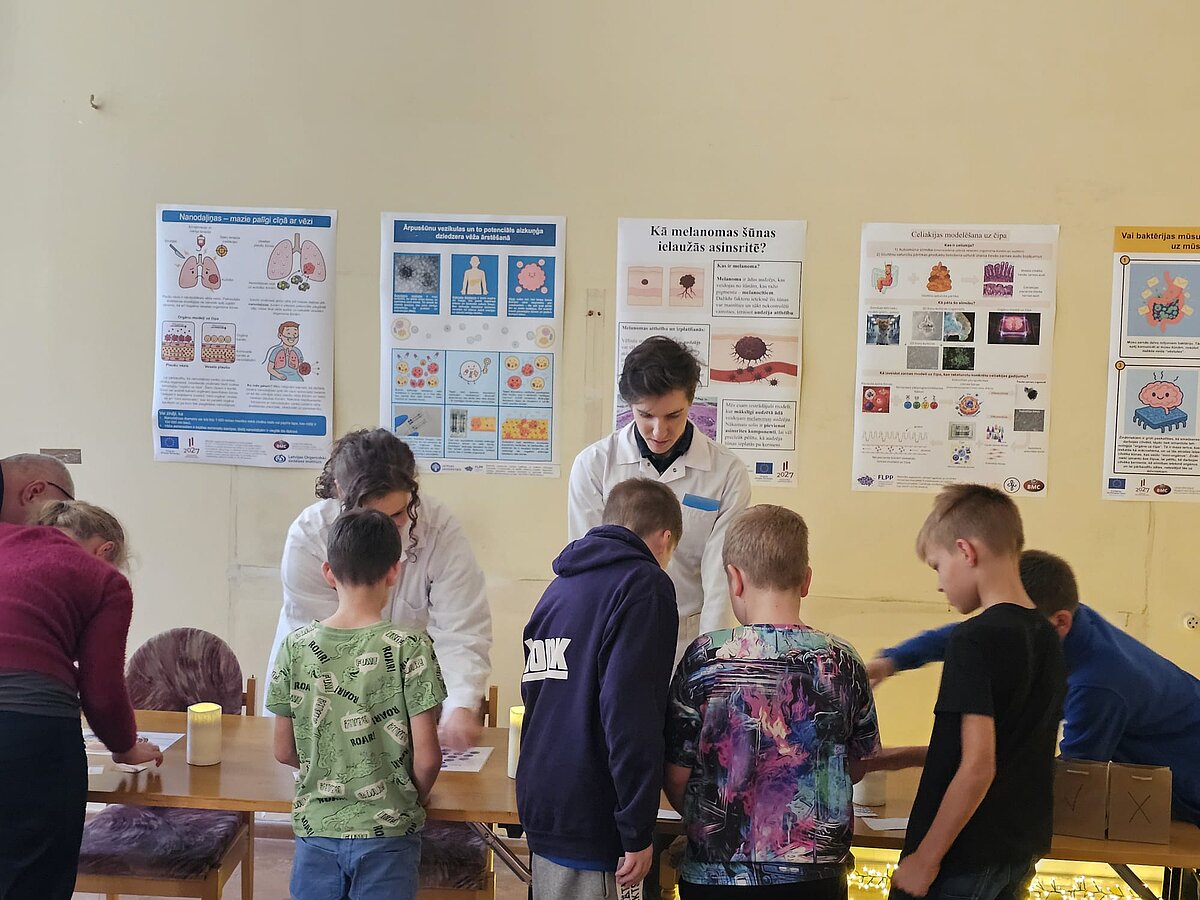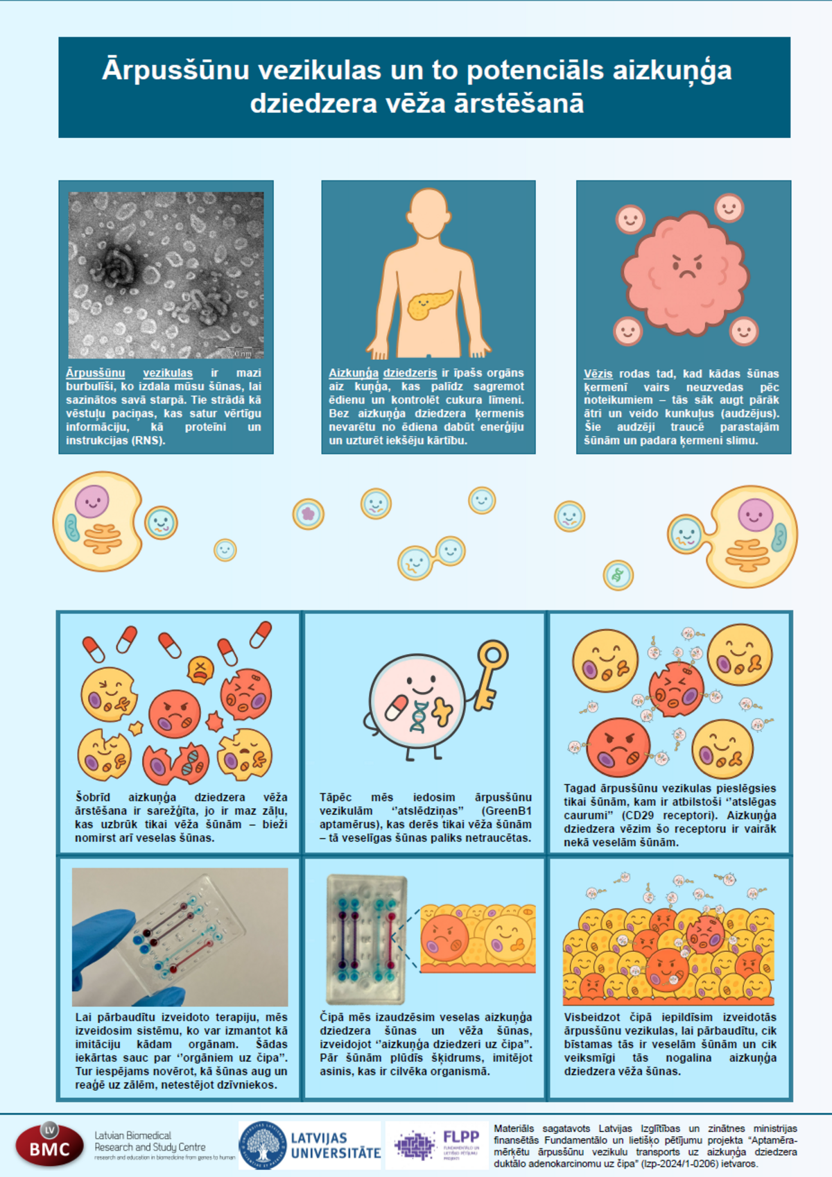 FLPP projekta “Aptamēra-mērķētu ārpusšūnu vezikulu transports uz aizkuņģa dziedzera duktālu adenokarcinomu uz čipa” (Nr. lzp-2024/1-0206) ietvaros Latvijas Universitātes un Latvijas Biomedicīnas pētījumu un studiju centra pētnieki iepazīstināja dažāda vecuma interesentus ar projekta mērķiem un pētniecības tēmu.