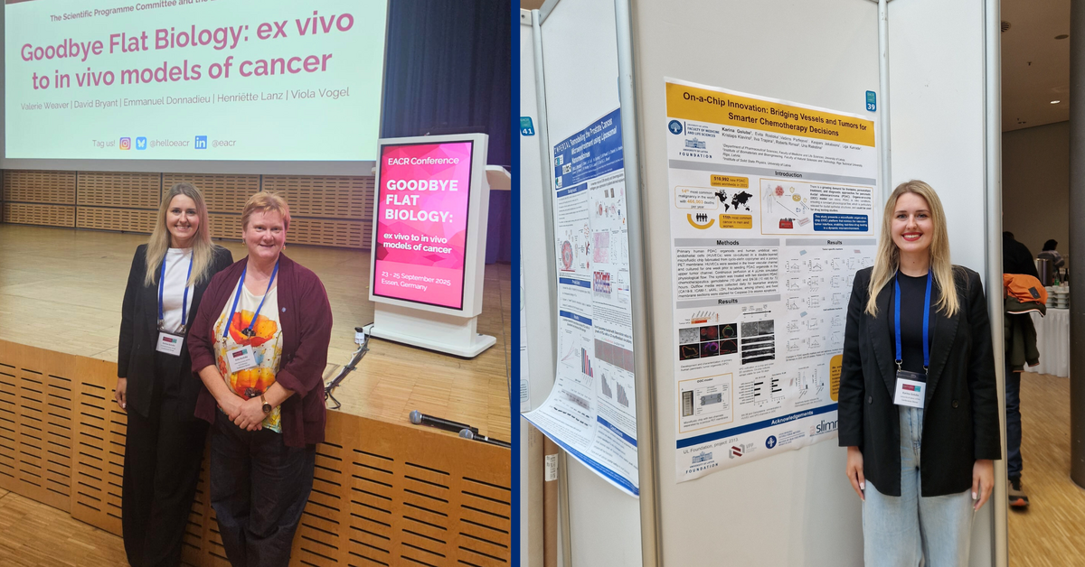 No 23. līdz 25. septembrim Latvijas Universitātes Medicīnas un dzīvības zinātņu fakultātes Farmācijas zinātņu nodaļas vadošā pētniece Dr. Evita Rostoka un doktorante Karīna Goluba piedalījās Eiropas Vēža pētniecības asociācijas (European Association for Cancer Research, EACR) rīkotajā konferencē “Goodbye Flat Biology: ex vivo to in vivo models of cancer”, kas norisinājās Esenē, Vācijā.