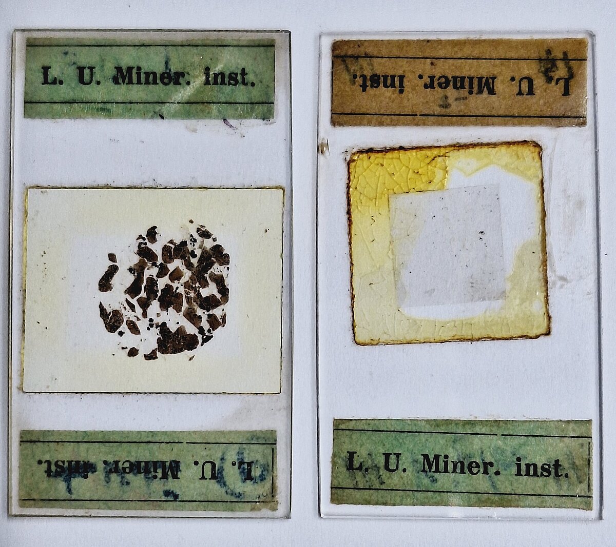 Parasti pētījumos izmantotas minerālu kristālu vai to atlūzu frakcijas mazākas par 0,5 mm (visbiežāk ne sīkākus par 0,01 mm). Bez lupas un polarizētas gaismas mikroskopa ieraudzīt pētāmo materiālu praktiski nav iespējams. Tādēļ no analizējamā materiāla tiek gatavoti īpaši preparāti. Mikrokristālu optiskās īpašības diagnosticē visā pasaulē par standartu pieņemtos 0,03 mm plānos preparātos, kur lielākā daļa minerālu (izņēmums ir metālu rūdu minerāli) cauri ejošā gaismā kļūst caurspīdīgi. Arī šodien LU ģeoloģijas studiju kursos tādus gatavo un izmanto. LUM saglabātajās 20.gs. pirmās puses kolekcijās (3. att.) atrodami gan preparāti ražoti Vācijā (4. att.) 19.gs., gan LU Mineraloģijas institūtā sagatavoti (5. att.).