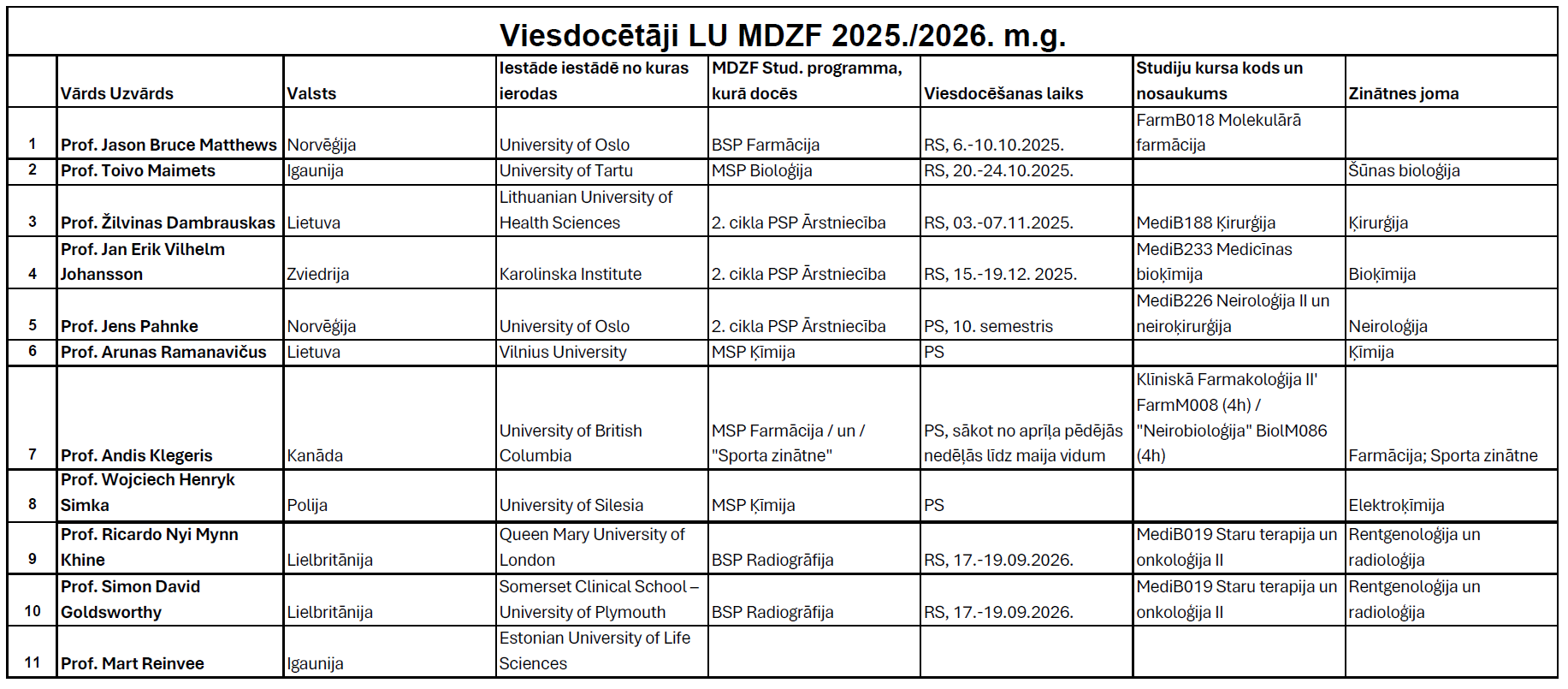 Lai stiprinātu studiju kvalitāti un sekmētu starptautisku sadarbību, Latvijas Universitātes Medicīnas un dzīvības zinātņu fakultāte (LU MDZF) 2025.–2026. studiju gadā uzņem viesdocētājus no vadošajām Eiropas un pasaules universitātēm. Šīs vizītes ir būtiska fakultātes stratēģijas daļa, veidojot vidi, kurā topošajiem speciālistiem ir iespēja mācīties no pasaulē atzītiem pētniekiem un praktiķiem.