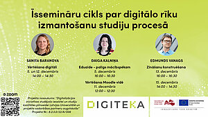 Latvijas vadošo augstskolu sadarbības projekta DIGITEKA ietvaros Latvijas augstskolu docētāji aicināti piedalīties īsformāta darbnīcās, kur ar savu pieredzi par digitālo rīku izmantošanu studiju procesa plānošanā un vērtēšanā, zināšanu konstruēšanā, atgriezeniskās saites sniegšanā, kā arī jēgpilnai mācīšanās analītikai dalīsies Latvijas Universitātes mācībspēki asoc. prof. Sanita Baranova, docente Daiga Kalniņa un docents Edmunds Vanags.
