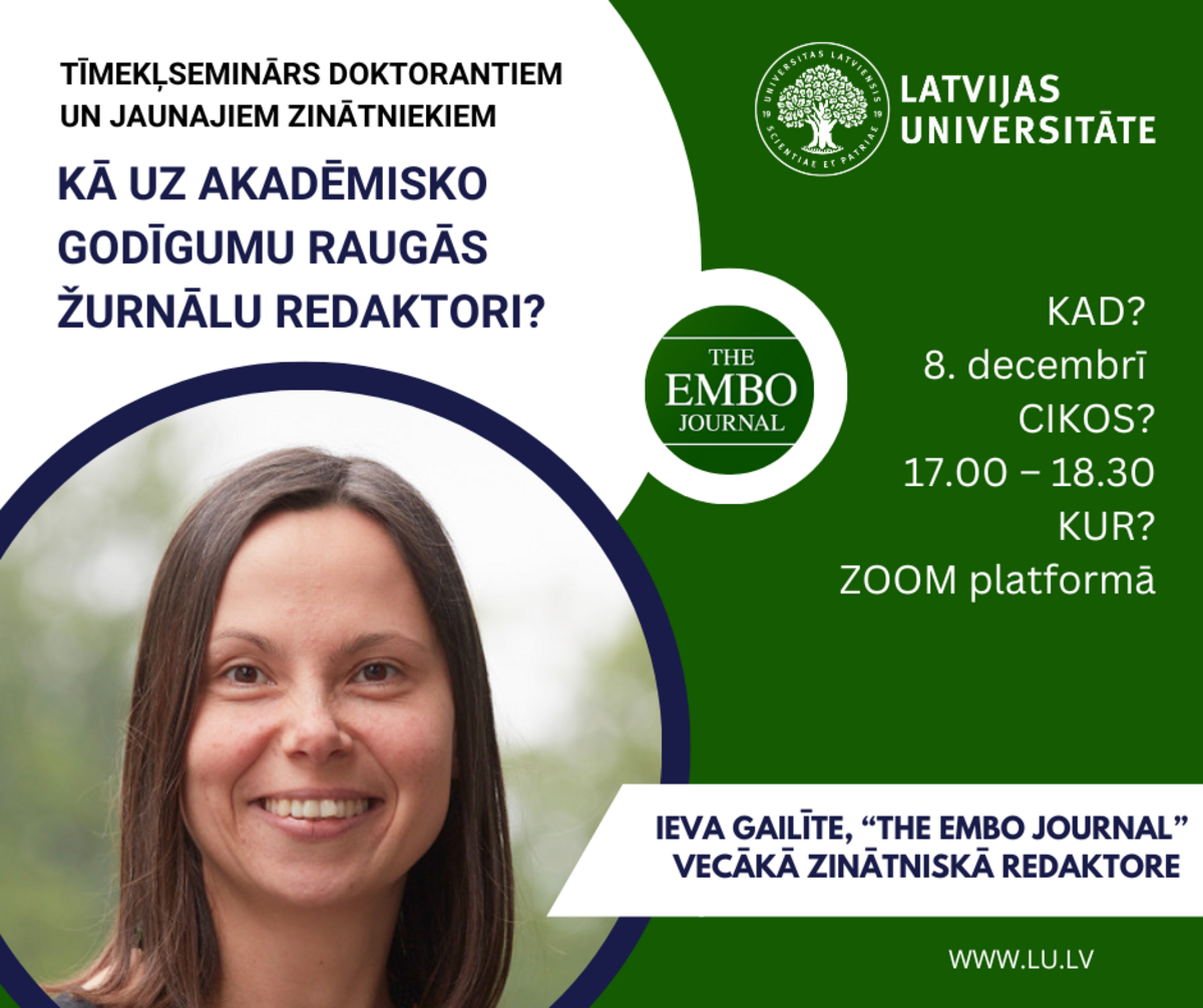 Tīmekļseminārā akadēmiskā žurnāla “The EMBO Journal” (https://www.embopress.org) vecākā zinātniskā redaktore Ieva Gailīte stāstīs par sava ikdienas darba principiem, īpaši pievēršoties akadēmiskā godīguma aspektiem, tostarp autortiesību un interešu konfliktu jautājumiem, recenzentu konfliktsituācijām, manuskriptu korekcijām un biežāk sastopamajām datu apstrādes un prezentācijas kļūdām. Tīmekļseminārā tiks arī apskatīts zinātniskās publikācijas cikls, izklāstot, kā no manuskripta pieteikšanas žurnālam tas nonāk līdz publikācijai žurnālā.